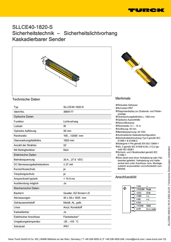 Turck Kurtyna bezpieczeństwa SLLCE40-1820-S Wysokość ochronna 1820 mm