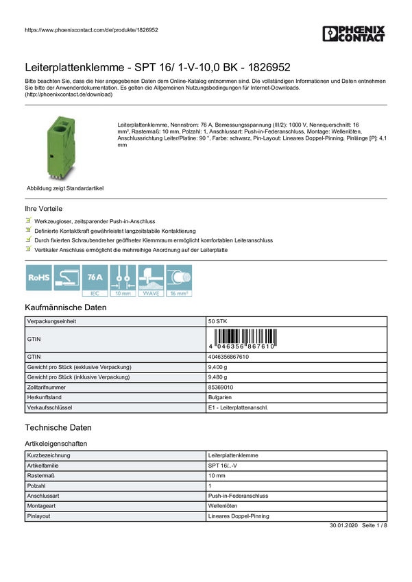 Phoenix Contact 1826952 Terminal PCB 16 mm² Ilość styków 1 czarny 50 szt.