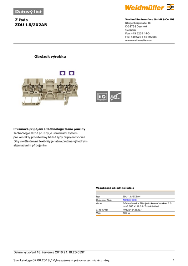 Złączka szynowa przelotowa Weidmüller 1826970000 sprężynowe 100 szt.