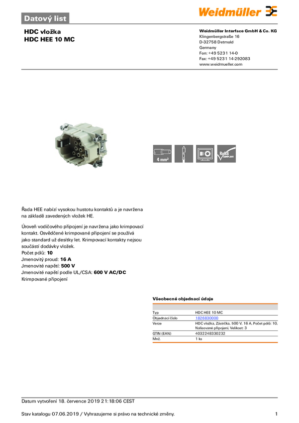 Weidmüller HDC HEE 10 MC 1826830000 Wstawka pinowa męska 1 szt.