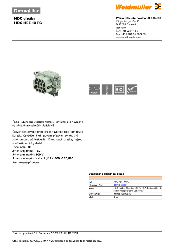 Weidmüller HDC HEE 10 FC 1826840000 Wkładka złącza żeńskiego 1 szt.