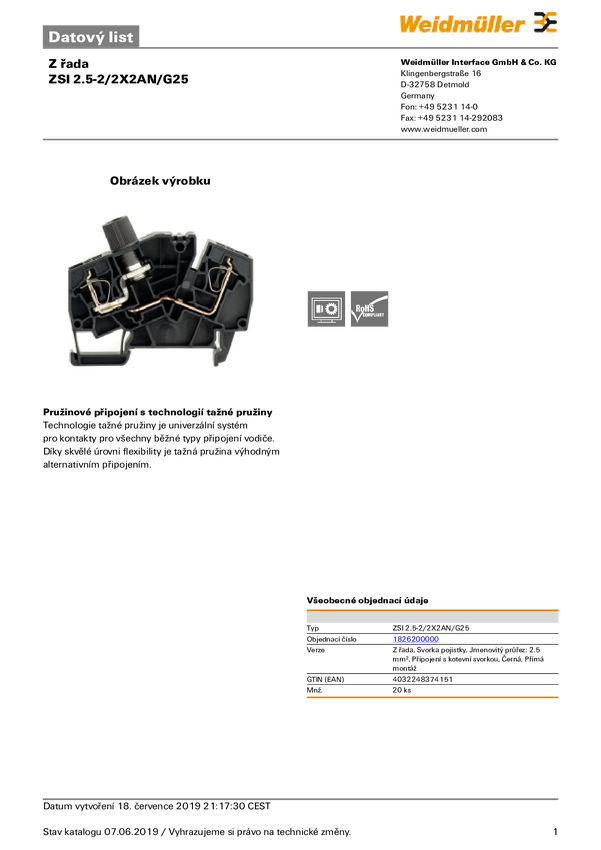 Zacisk szynowy bezpiecznika Weidmüller 1826200000 sprężynowe 20 szt.