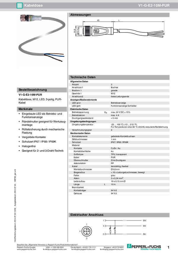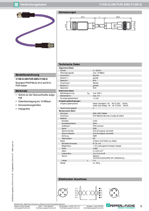 Pepperl+Fuchs 186243 Złącze czujnika/aktuatora V15B-G-2M-PUR-ABG-V15B-G, piny: 2, 5, 2.00 m, 1 szt.