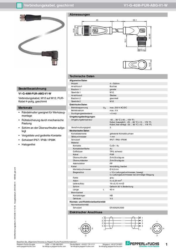 Pepperl+Fuchs 186189 Złącze czujnika/aktuatora M12 złącze męskie kątowe, złącze żeńskie proste 40.00 m Ilość pinów: 4 1