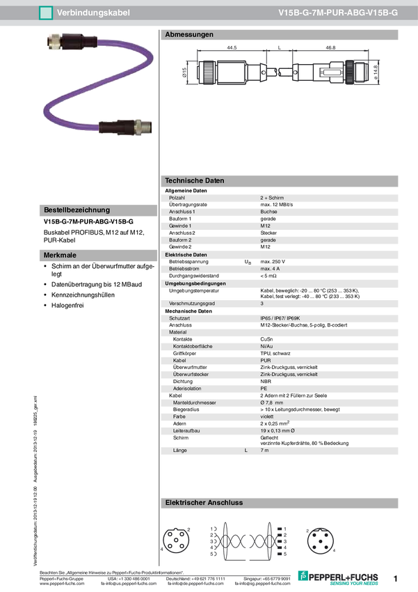 Pepperl+Fuchs 186225 Złącze czujnika/aktuatora V15B-G-7M-PUR-ABG-V15B-G, piny: 2, 5, 7.00 m, 1 szt.