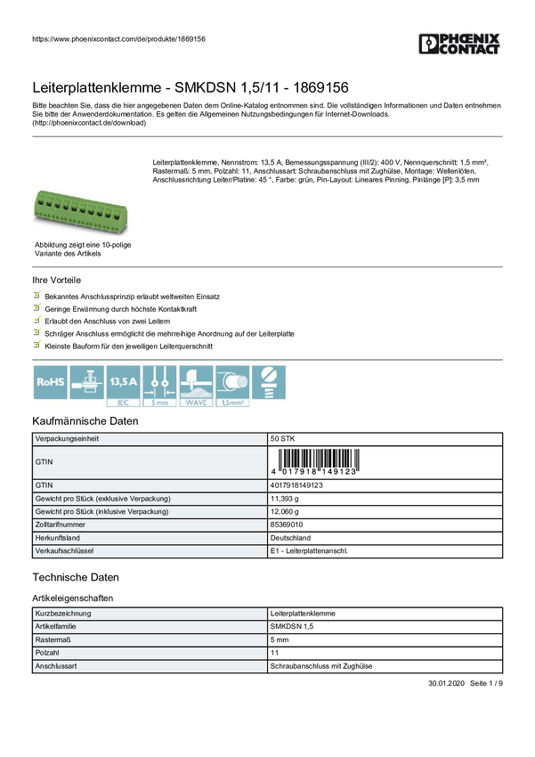 Phoenix Contact 1869156 Terminal PCB 1.5 mm² Ilość styków 11 zielony 1 szt.