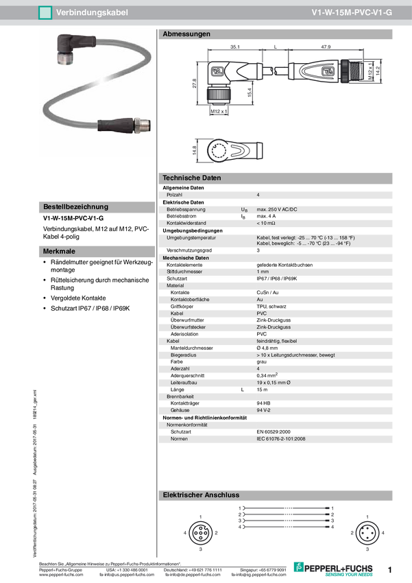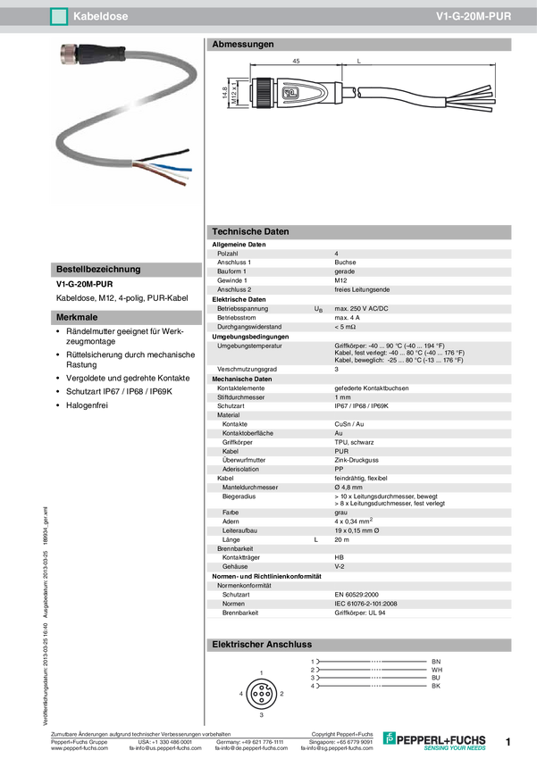 Pepperl+Fuchs 189934 Gniazdo kablowe V1-G-20M-PUR, piny: 4, 20.00 m, 1 szt.