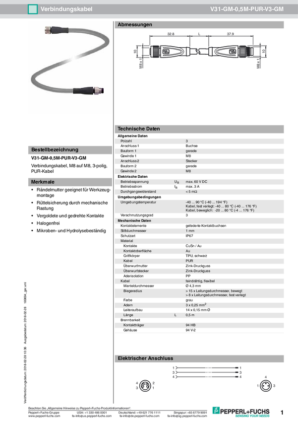 Pepperl+Fuchs 189694 Złącze czujnika/aktuatora V31-GM-0,5M-PUR-V3-GM, piny: 3, 0.50 m, 1 szt.