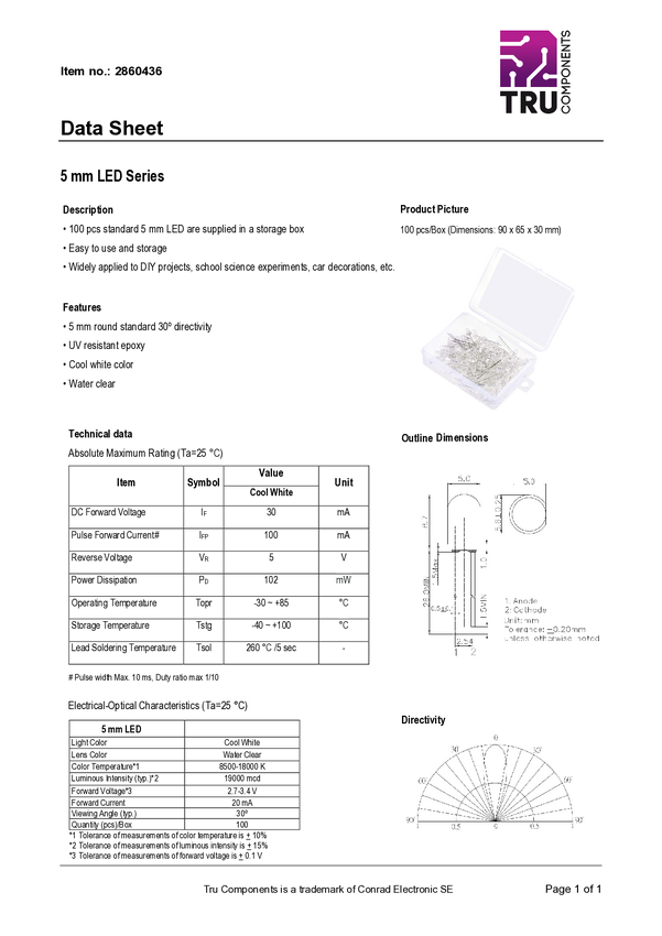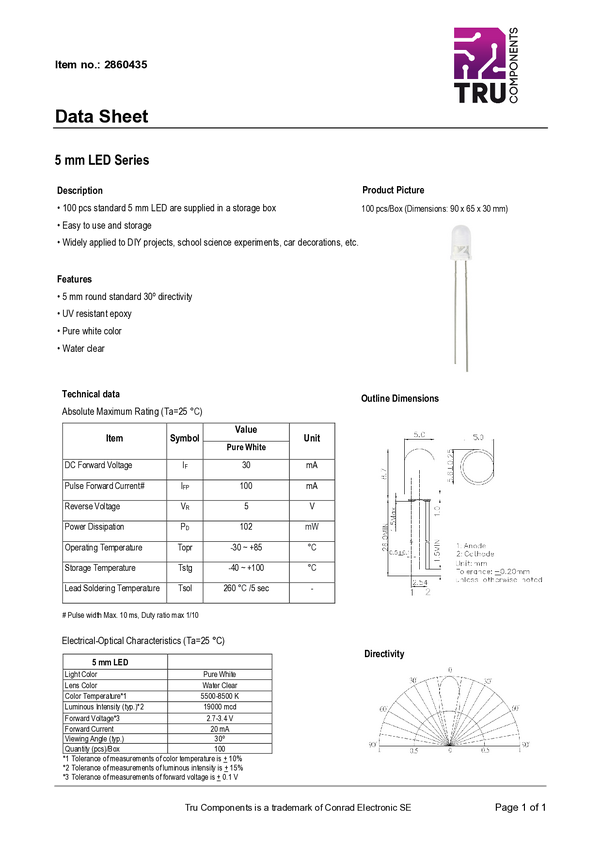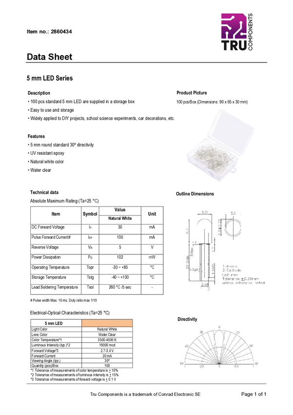 Dioda LED THT TRU COMPONENTS TC-11441752, 5 mm, 90 mcd, 420 mcd, 2180 mcd, 19000 mcd, 100 szt.