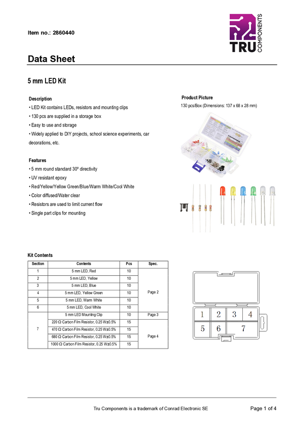 Dioda LED THT TRU COMPONENTS TC-11441760, 5 mm, 90 mcd, 420 mcd, 2180 mcd, 19000 mcd, 130 szt.