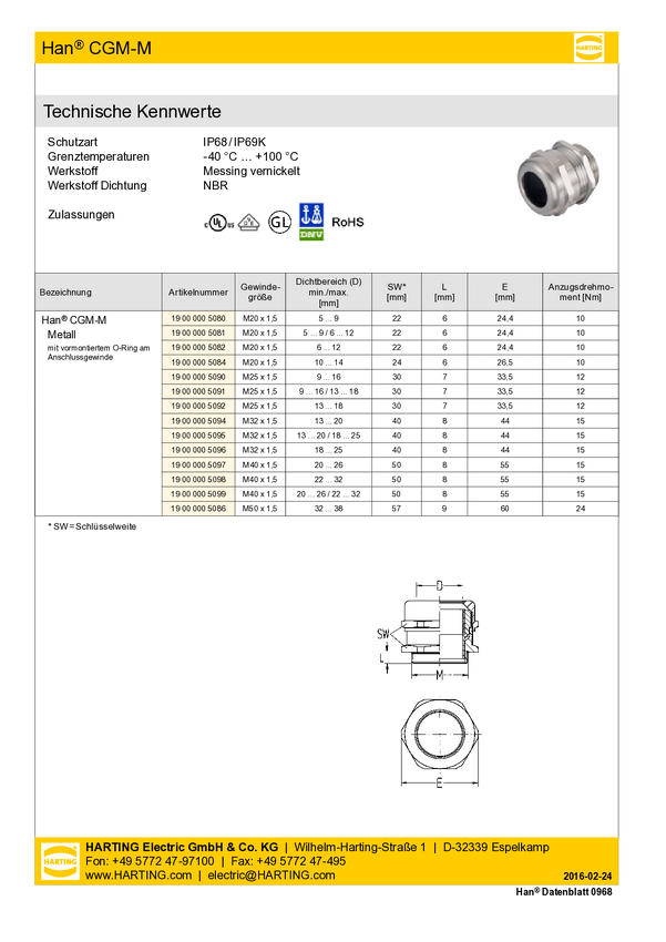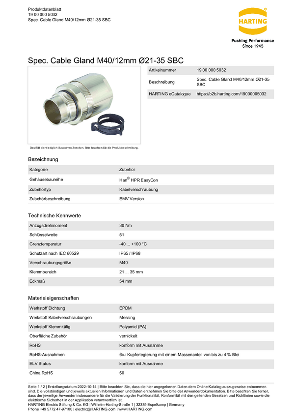 Harting 19000005032 Dławnica kablowa 19 00 000 5032, od 21 mm, do 35 mm, M40, 1 szt.