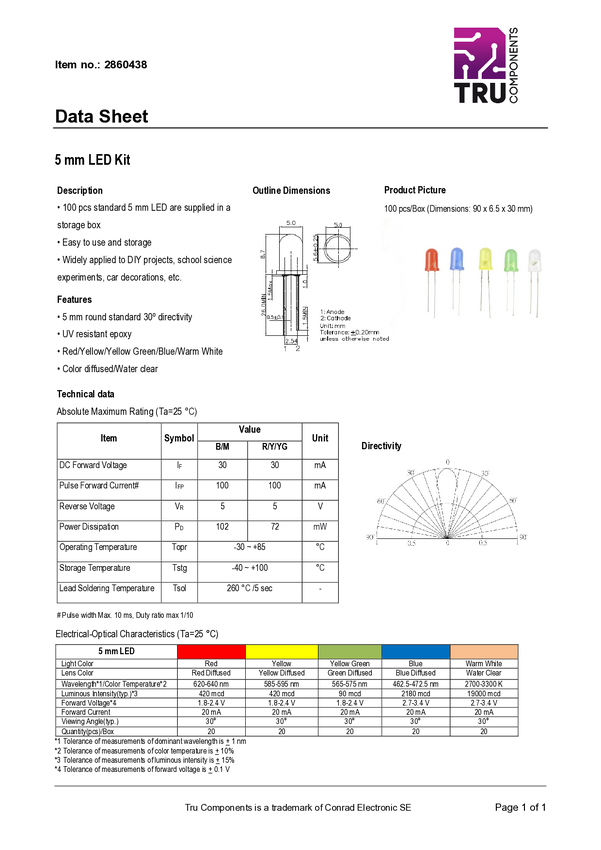 Dioda LED THT TRU COMPONENTS TC-11441768, 5 mm, 90 mcd, 420 mcd, 2180 mcd, 19000 mcd, 280 szt.