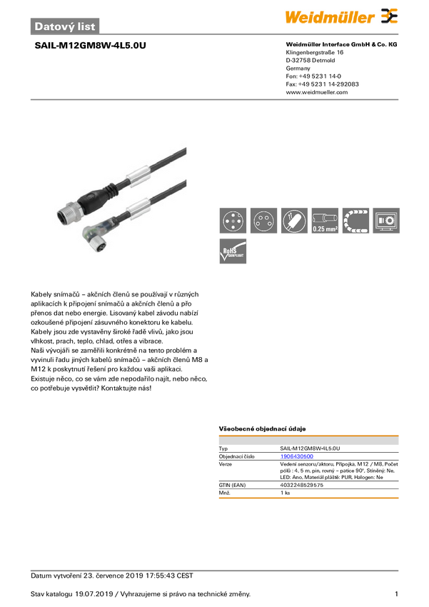 Przewód połączeniowy Weidmüller SAIL-M12GM8W-4L5.0U 1906430500 1 szt.