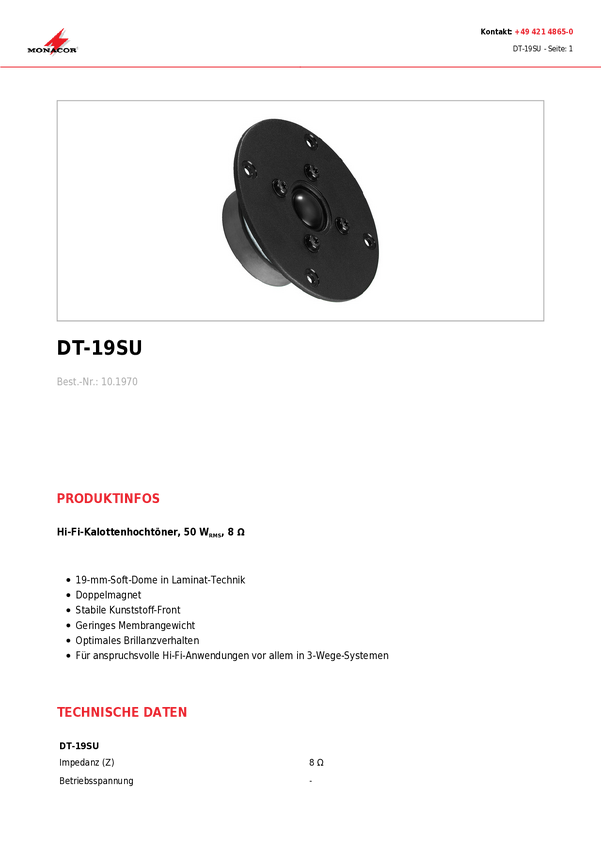 Głośnik wysokotonowy Monacor DT-19SU, 50 W/80 W, 8 Ω