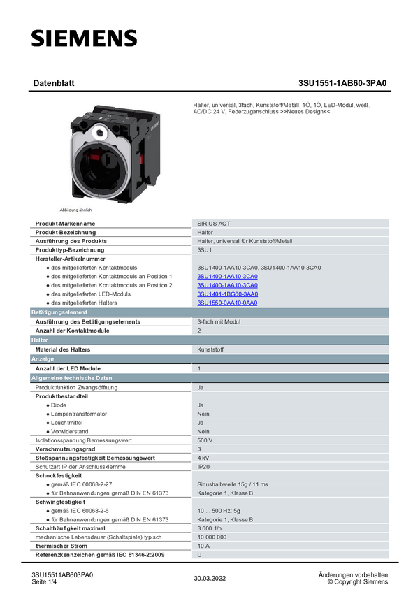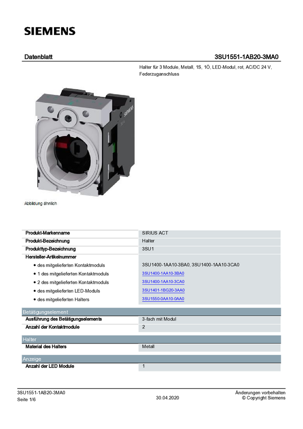 Uchwyt Siemens 3SU1551-1AB30-3MA0 (S x W) 30 mm x 40 mm 1 szt.