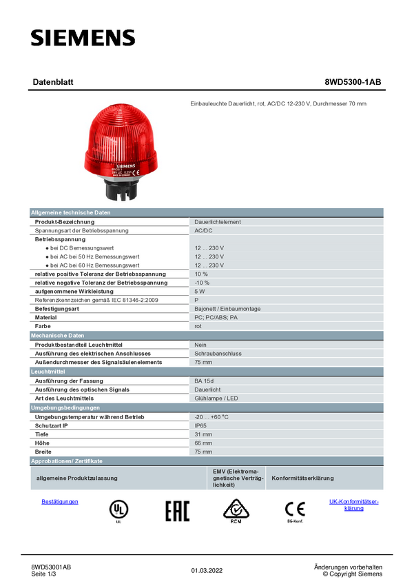 Lampa sygnalizacyjna Siemens 8WD5300-1AB (Ø x W) 70 mm x 66 mm 1 szt.