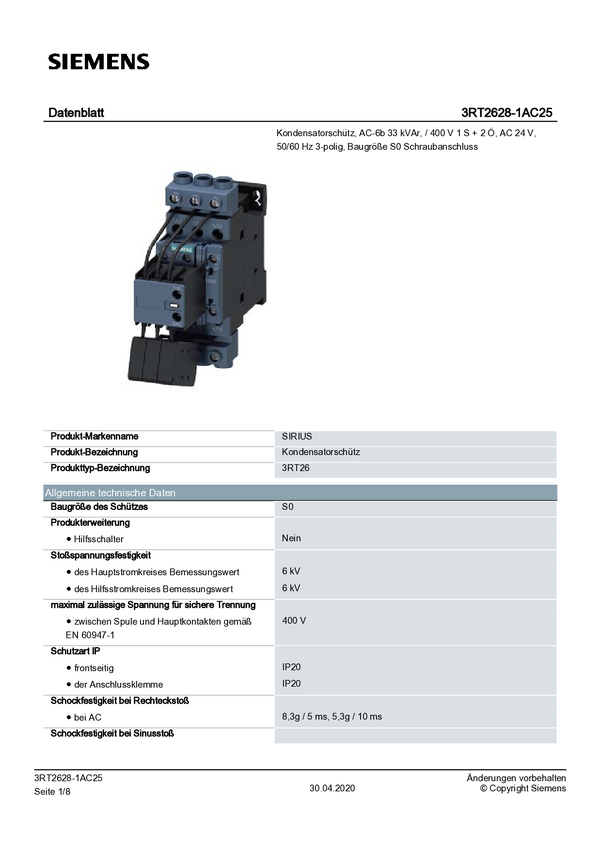 Stycznik kondensatorowy Siemens 3RT2628-1AC25 3RT26281AC25, 3 styki, 1 szt.