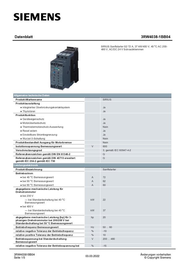Siemens 3RW4038-1BB04 3RW40381BB04 Soft-start Moc silnika przy 400 V 37 kW 480 V Natężenie znamionowe 72 A