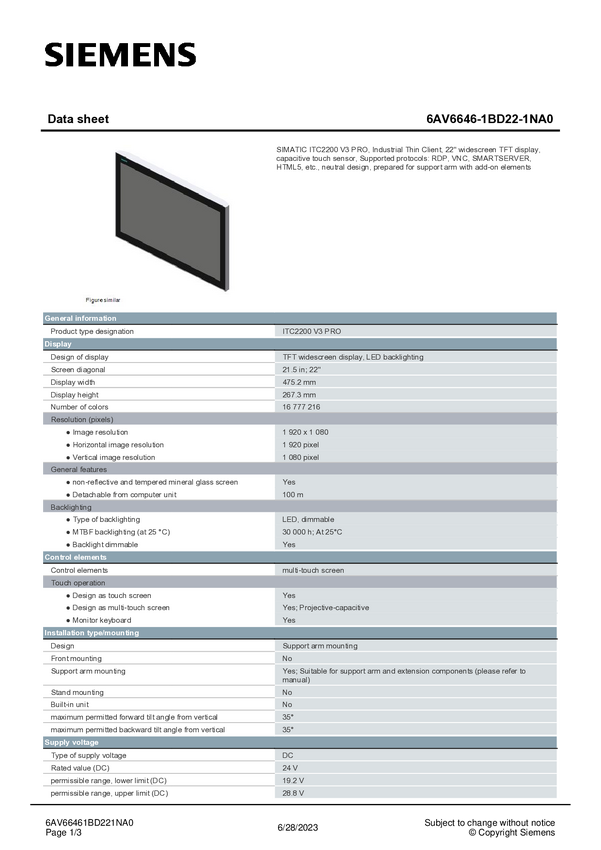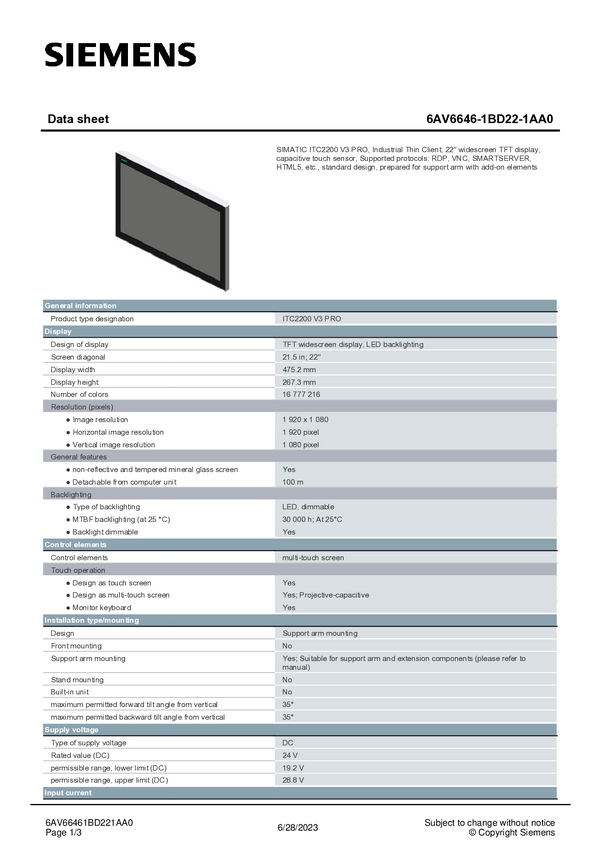 Panel obsługi PLC Siemens 6AV6646-1BD22-1NA0 6AV66461BD221NA0
