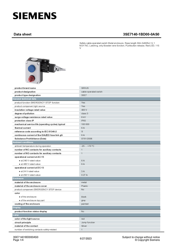 Siemens 3SE71401BD000AS0 Wyłącznik kablowy 3SE7140-1BD00-0AS0, 1 szt.