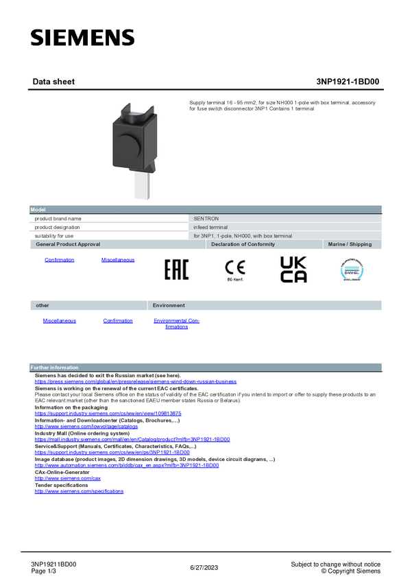 Złącze instalacyjne Siemens 3NP1921-1BD00 1 szt.