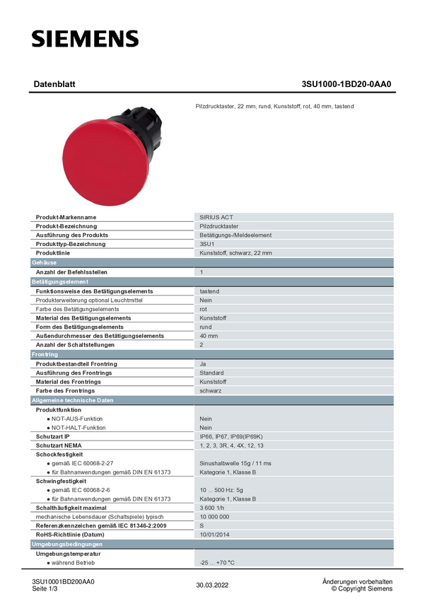 Siemens 3SU10001BD200AA0 3SU1000-1BD20-0AA0 Przycisk grzybkowy pierścień przedni z tworzywa sztucznego przycisk czarny,