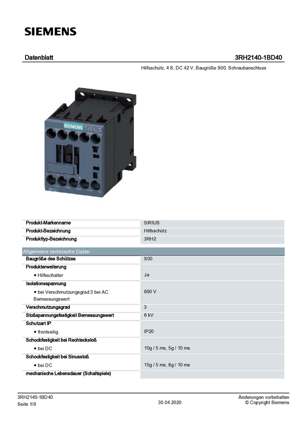 Stycznik pomocniczy Siemens 3RH2140-1BD40 3RH21401BD40, 10 A, 1 szt.