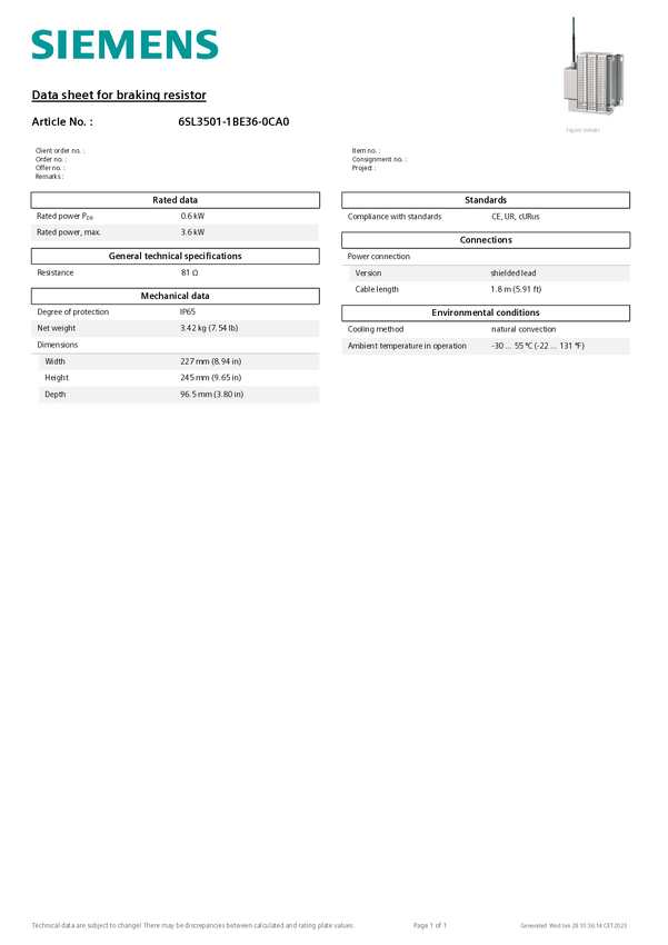 Rezystor hamujący Siemens 6SL3501-1BE36-0CA0