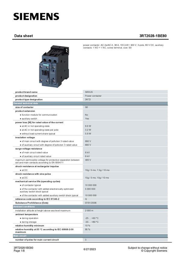 Stycznik Siemens 3RT2028-1BE80 3RT20281BE80, 1 szt.