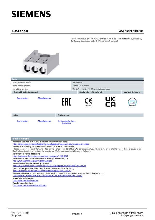 Płaskie połączenie Siemens 3NP1931-1BE10 1 szt.