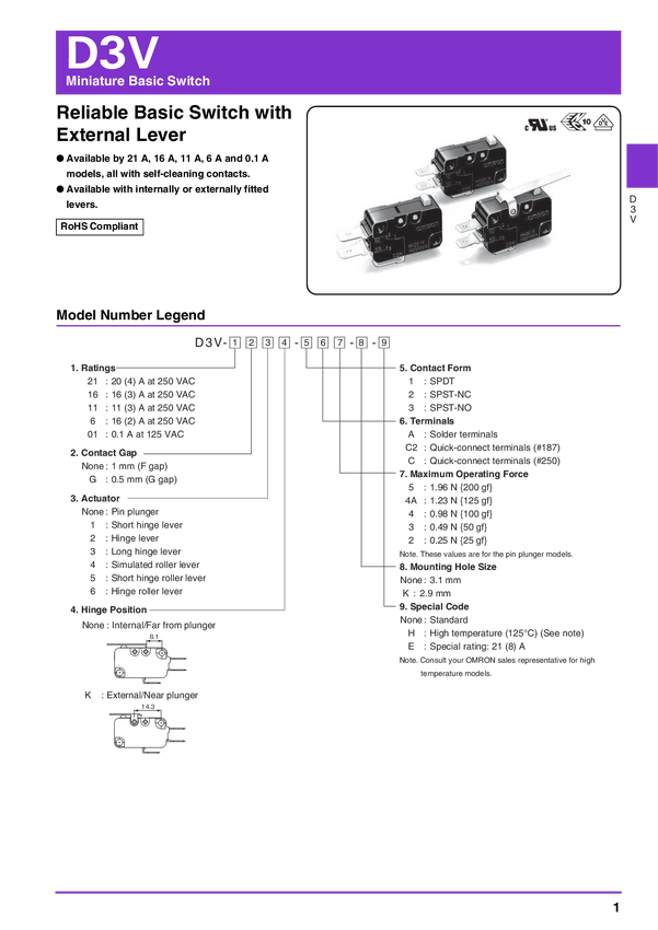 Switch Snap Action N.O./N.C. SPDT Long Hinge Lever Quick Connect 15A 250VAC 250VDC 372.85VA 0.69N Screw Mount