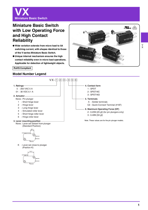Omron VX-01-1C22 Mikroprzełącznik, 1 zestyk przełączny, 1 x wł/(wł), 30 V/DC, 0.1 A, 1 szt.