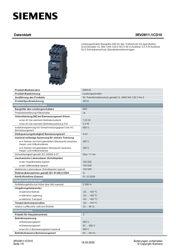 Wyłącznik zasilania Siemens 3RV2811-1CD10 Zakres ustawienia (Prąd): 2.5 A (max) Maksymalne napięcie przełączania: 690 V/