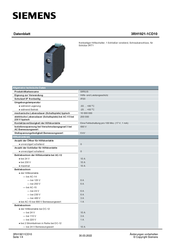 Siemens 3RH1921-1CD10 Przełącznik pomocniczy 1 szt.