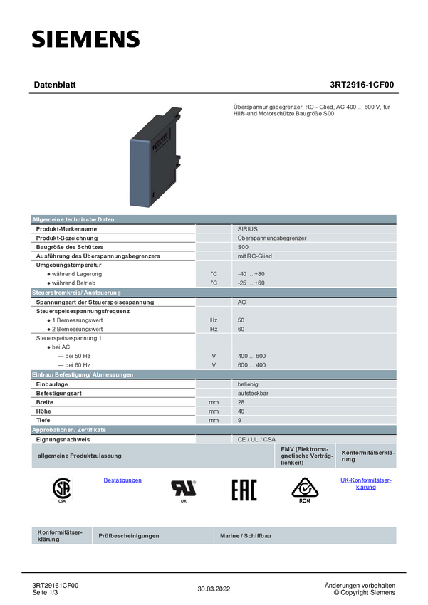 Ochrona przeciwprzepięciowa Siemens 3RT2916-1CF00 element RC 1 szt.