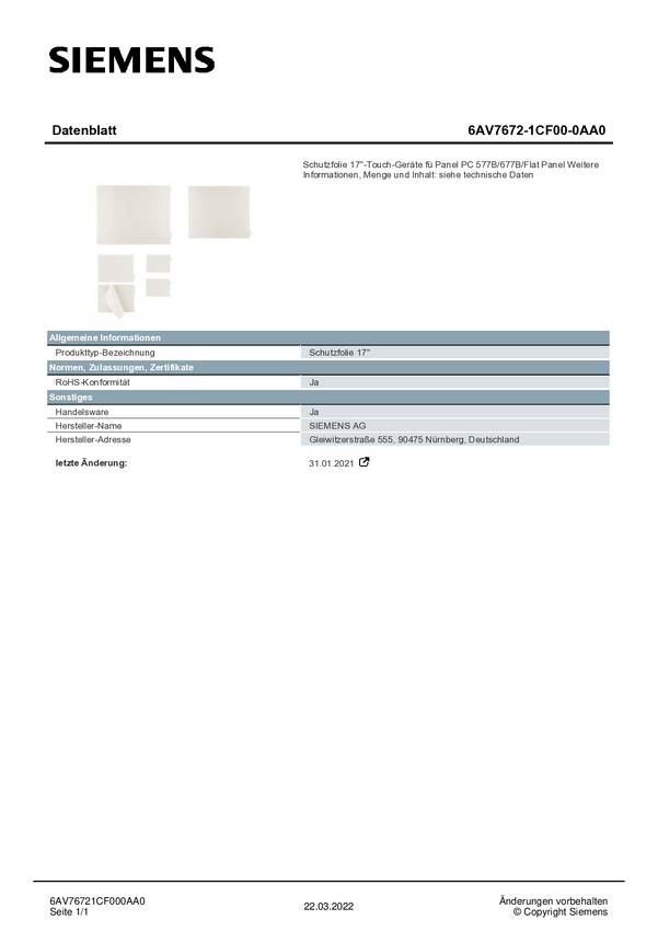Folia ochronna PLC Siemens 6AV7672-1CF00-0AA0 6AV76721CF000AA0