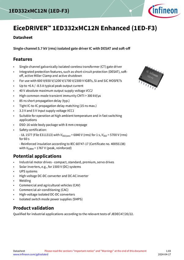 8.5 A, 5.7 kV (rms) single-channel isolated gate driver with short-circuit protection and active Miller clamp, UL 1577 & VDE 0884-11 certified EiceDRIVER™ Enhanced single-channel isolated gate driver with +6 A / -8.5 A typical sourcing and sinking peak output current in a DSO-16 wide body package with 8 mm creepage for IGBTs, MOSFETs and SiC MOSFETs. 1ED3323MC12N belongs to the EiceDRIVER™ Enhanced 1ED332x family (F3 family). 1ED3323 offers short-circuit protection (DESAT) for IGBTs and SiC MOSFETs. Th