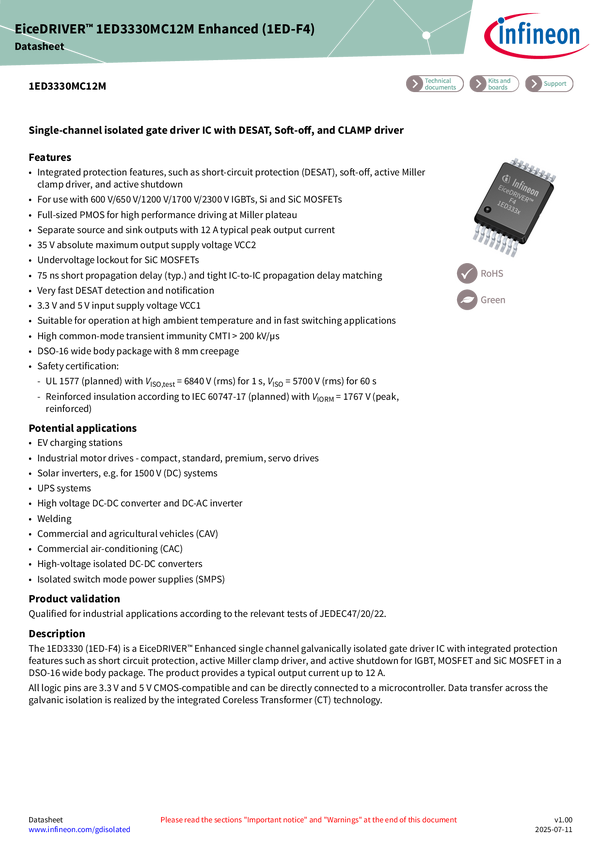 5.7kV (rms) single-channel galvanic isolated gate driver IC with DESAT, active Miller clamp driver, Soft-off, UVLO, and shutdown with fault EiceDRIVER™ Enhanced 5.7 kV single-channel isolated gate driver IC with ±12 A typical sinking and sourcing peak output current in small space-saving DSO-16 fine pitch wide-body package with large creepage distance (>8 mm) ideal for SiC MOSFETs. The gate driver IC also includes integrated protection features such as DESAT protection, active Miller clamp driver, and a