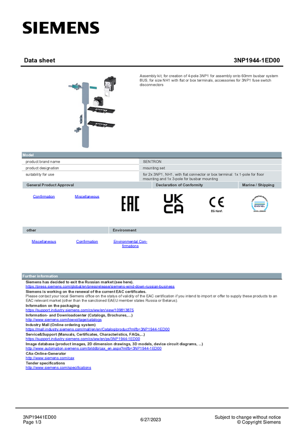 Zestaw montażowy Siemens 3NP1944-1ED00 1 szt.