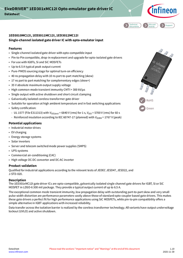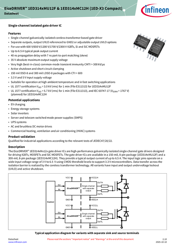 5.7 kV (rms) single-channel gate driver IC with reinforced isolation, 6.5 A output current, Opto-emulator input, 12.5 V UVLO EiceDRIVER™ Lite 2300 V single-channel isolated gate driver with 6.5 A sinking and 6 A sourcing peak output current in 6-pin LDSO wide body package for SiC MOSFETs.