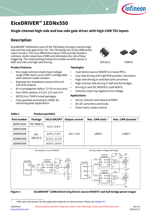 1-channel non-isolated gate-driver IC family with truly differential inputs The 1EDN8550B is a non-isolated gate-driver IC and available in a small SOT-23 package. It has truly differential inputs enabling cost-effective solutions with exceptional power density in:Boost-PFC with Kelvin-source MOSFETsSynchronous rectification stagesDesigns with long distance between control IC and gate-driver ICBuck-boost convertersLow- and medium-voltage half-bridgesHigh density 48V to 12V intermediate bus converter