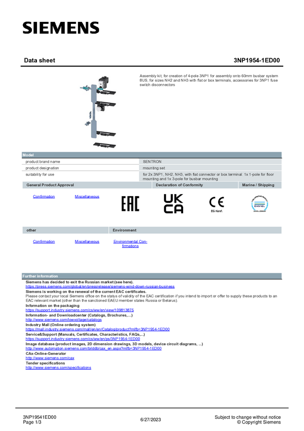 Zestaw montażowy Siemens 3NP1954-1ED00 1 szt.