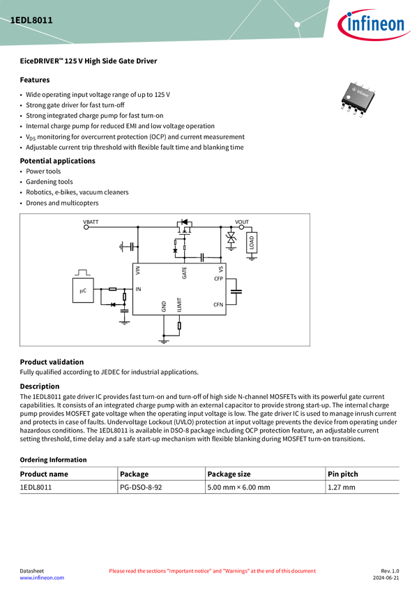 125 V high-side gate driver with single output in DSO-8 package for battery-powered applications The EiceDRIVER™ 1EDL8011 provides fast turn-on/ turn-off of high-side N-channel MOSFETs with its powerful gate current capabilities. For battery-powered applications, 1EDL8011 is used to manage inrush current & protects in case of faults. The driver is available in DSO-8 package including OCP protection feature, adjustable current setting threshold, time delay and a safe start-up mechanism with flexible bla