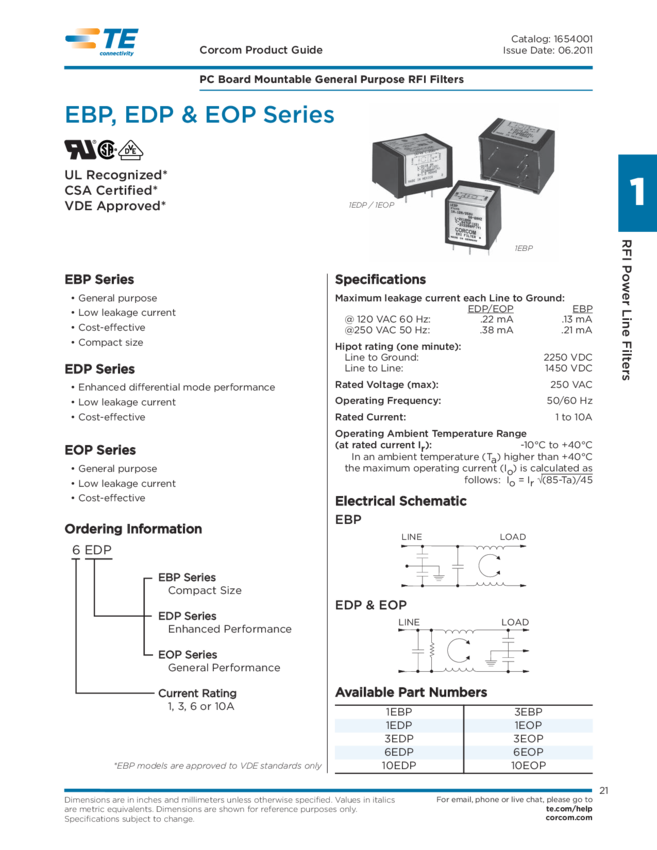 Power Line Filter 50Hz/60Hz 1A 250VAC PC Pins Thru-Hole