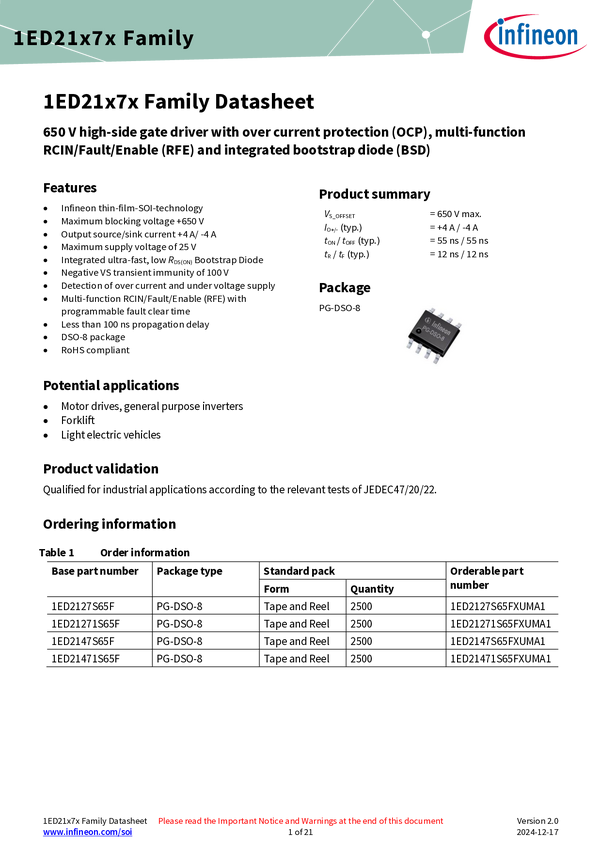 650 V high-side gate driver IC with over current protection (OCP), multi-function RCIN/Fault/Enable (RFE) and integrated bootstrap diode (BSD) EiceDRIVER™ 650 V high side single channel gate driver IC with a typical 4 A source and 4 A sink current in DSO-8 package for IGBTs, MOSFETs and SiC MOSFETs.