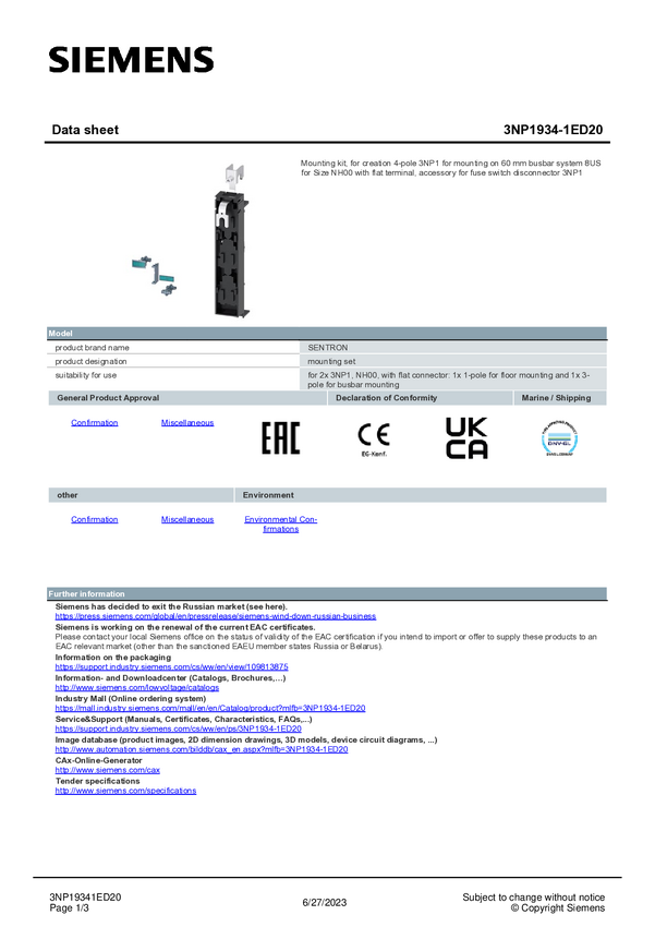 Zestaw montażowy Siemens 3NP1934-1ED10 1 szt.