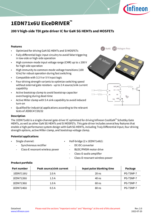 200 V high-side TDI gate driver IC for GaN SG HEMTs and MOSFETs The 1EDN7146U is a single-channel gate-driver IC optimized for driving Infineon CoolGaN™ Schottky gate (SG) HEMTs, as well as other GaN SG HEMTs and Si MOSFETs This gate driver includes several key features that enable a high-performance system design with fast-switching transistors, including Truly Differential Input (TDI), 0.5 A peak source and sink current, active Miller clamp, and bootstrap voltage clamp.
