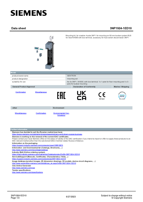 Zestaw montażowy Siemens 3NP1924-1ED10 1 szt.