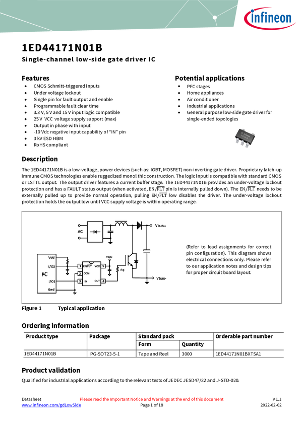 25 V single-channel low-side gate driver with integrated fault reporting and enable functionality EiceDRIVER™ 25 V single-channel low-side non-inverting gate driver IC with typical 2.6 A source and sink currents in a tiny 5-lead PG-SOT23 package. It can be used in conjunction with IPMs which integrate a PFC IGBT but no PFC gate driver IC. The logic input is compatible with standard CMOS or LSTTL output. The 1ED44171N01B provides an integrated fault reporting output and adjustable fault clear timer at the u
