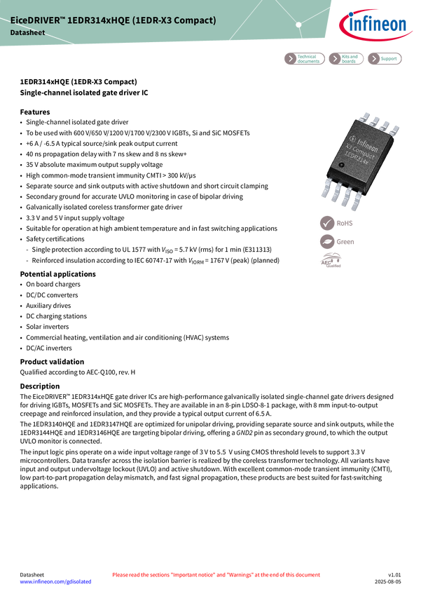 5.7 kV (rms) single-channel gate driver IC with AEC-Q100 qualification, reinforced isolation, 6.5 A output current, 15 V UVLO EiceDRIVER™ Compact 2300 V single-channel isolated gate driver with +/-6.5 A typical peak output current in an 8-pin DSO wide body package for GaN HEMTs, IGBTs, MOSFETs and SiC MOSFETs. Qualified according to AEC-Q100. Offers Separate Outputs, enabling separate turn-on and turn-off gate resistors without the need for a bypass Schottky diode.